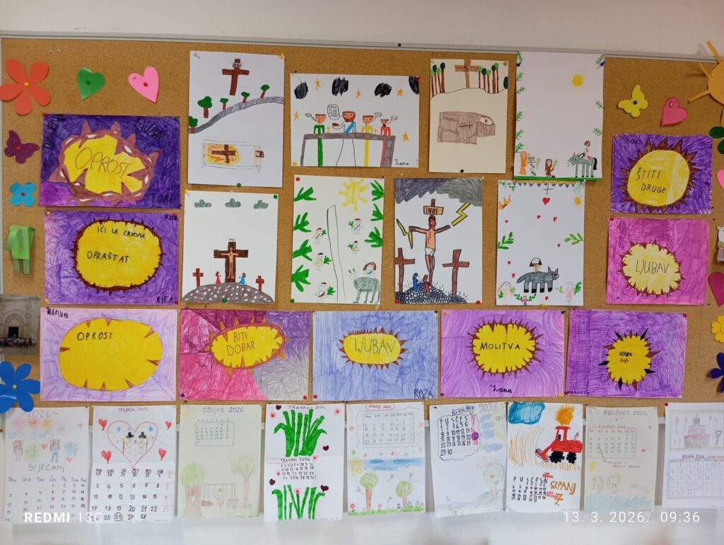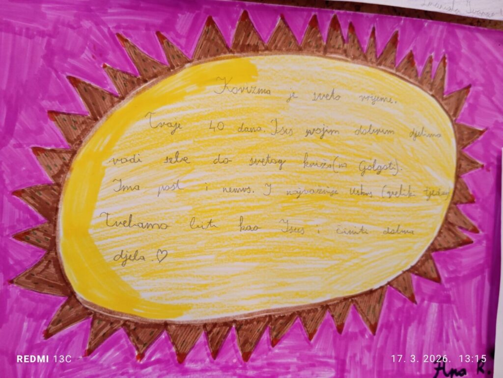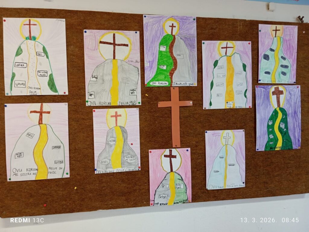 Svoja razmišljanja, osjećaje i korizmene odluke učenici su izrazili kroz maštovite likovne radove i kreativne aktivnosti. Crtali su motive križa, Isusove muke i uskrsnuća, ali i ispisivali poruke koje podsjećaju na važnost ljubavi, oprosta, molitve i pomaganja drugima. Posebno su dojmljivi radovi u kojima su zapisali vlastite korizmene odluke kao što su: slušanje roditelja, poštivanje drugih, izbjegavanje ružnih riječi, više strpljenja i dobrohotnosti.