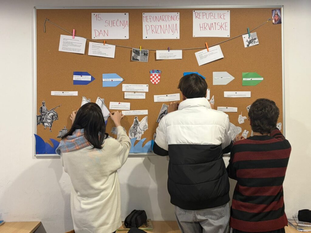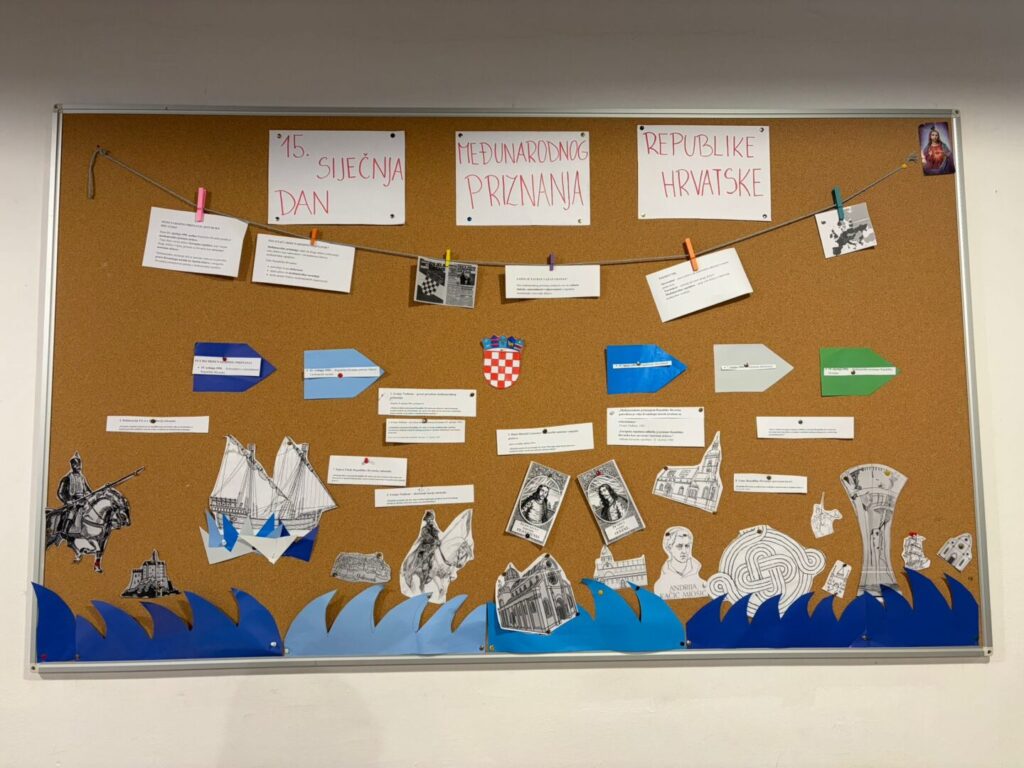 Kako bi stečeno znanje učinili vidljivim i trajnim, učenici 7. i 8. razreda izradili su razredni pano posvećen međunarodnom priznanju Republike Hrvatske. Republika Hrvatska međunarodno je priznata 15. siječnja 1992. godine, kada su je priznale države članice Europske zajednice i brojne druge zemlje svijeta. Na panou su prikazani ključni datumi, izvorni citati, kronologija, države koje su prve priznale Hrvatsku te povijesne fotografije i kratka objašnjenja. Ovakav način rada potiče suradnju, kreativnost i aktivno učenje te dodatno naglašava važnost ove teme u nastavi povijesti.