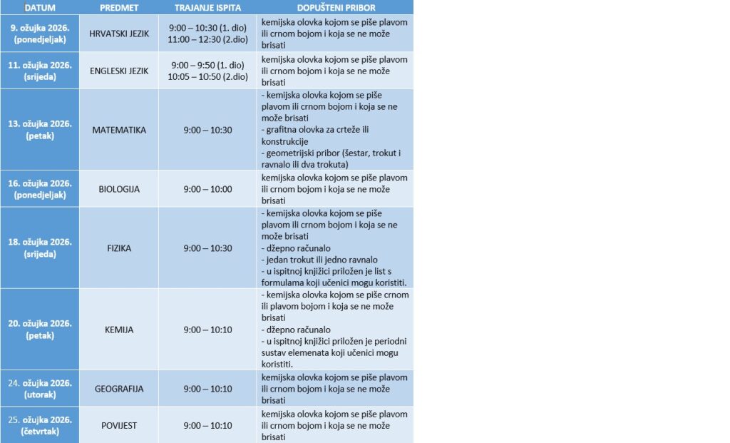U periodu od 9. ožujka do 26. ožujka u svim školama RH će se održati nacionalni ispiti za učenike 8. razreda. Nacionalne ispite organizira Nacionalni centar za vanjsko vrednovanje obrazovanja prema sljedećem rasporedu: