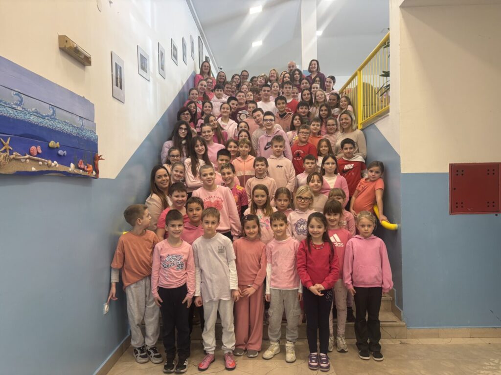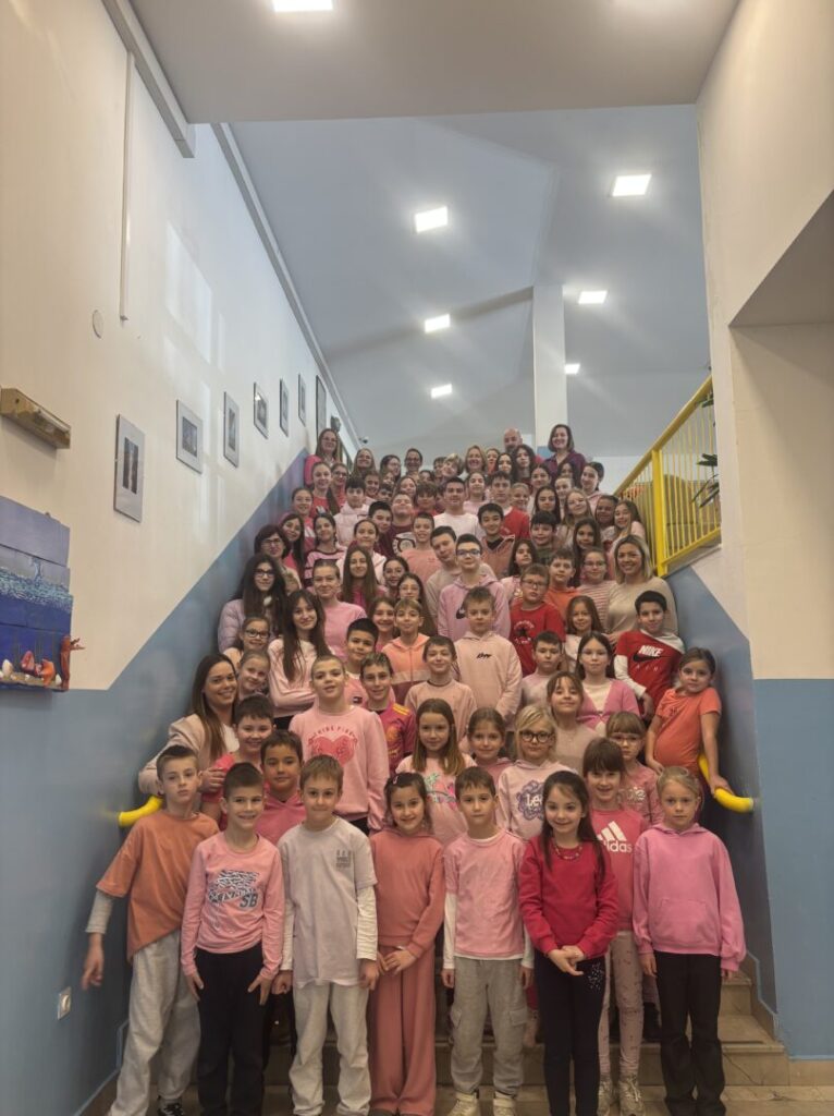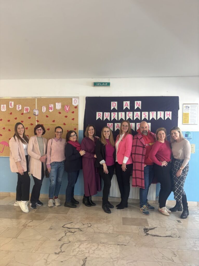 U našoj školi i ove godine tradicionalno obilježavamo Dan ružičastih majica, međunarodni dan posvećen podizanju svijesti o vršnjačkom nasilju i važnosti stvaranja sigurnog i podržavajućeg okruženja za svu djecu i mlade. Nošenjem ružičastih majica zajednički šaljemo poruku da nasilju nema mjesta među nama te da se svaki učenik treba osjećati prihvaćeno, sigurno i poštovano. Cilj ovog dana je potaknuti učenike, nastavnike i roditelje na promišljanje o vrijednostima empatije, tolerancije i međusobnog uvažavanja. Kroz zajedničke aktivnosti nastojimo razviti kulturu nenasilja i ohrabriti učenike da reagiraju kada svjedoče neprimjerenom ponašanju te da zatraže pomoć kad se susretnu s problemom. Naša ružičasta majica je podsjetnik da svatko od nas može učiniti nešto kako bi škola bila mjesto u kojem se svaki učenik osjeća sigurno, uvaženo i slobodno biti ono što jest.