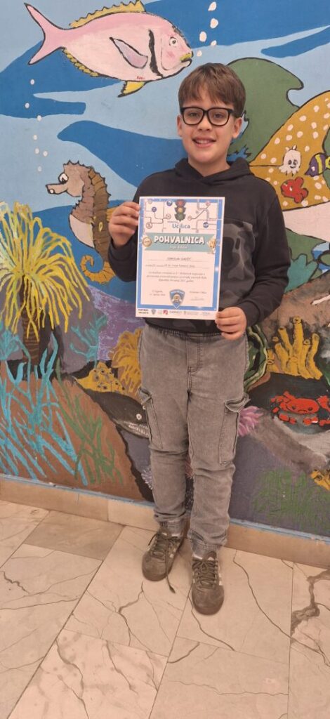 S ponosom objavljujemo kako je naš učenik Tomislav Jurišić ostvario najbolji rezultat u školi u kategoriji poznavanja prometnih propisa te za svoj uspjeh dobio pohvalnicu.