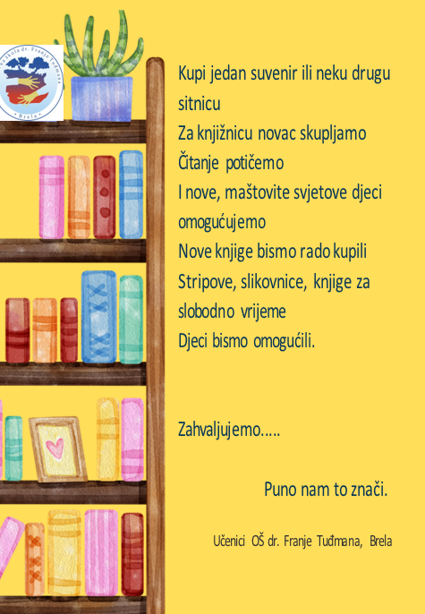 Želimo skupiti novac za nabavu stripova, slikovnica i knjiga za slobodno vrijeme za školsku knjižnicu. Unaprijed zahvaljujemo!
